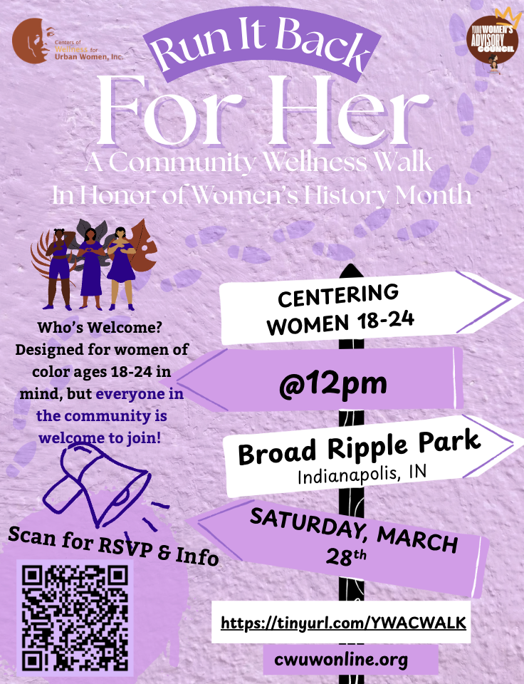 Young Women's Walk Saturday, March 28, 2026 12:00 PM 1:30 PM Center of Wellness for Urban Women 1426 Broad Ripple Avenue Indianapolis, IN, 46220 United States (map) Google Calendar ICS
